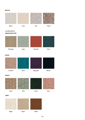 BOUCLÉ Blanc Ivoire CATÉGORIE 5 AQUACLEAN TITAN Chataigne Aqua MYSTIC Caramel Duck OTELLO Sand Mint Gris Taupe Groseille Duck CAPRI Aubergine Marine Forest Rose Beige Taupe Coffee 124
