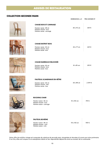 Hauteur assise : : 45 cm Matière Matière dossier: rotin rotin Matière Matière assise: rotin rotin DIMENSIONS L x H 40 x 93 cm 42 x 77 cm 41 x 83 cm 65 x 88 cm 51 x 100 cm 110 x 153 cm PRIX UNITAIRE HT
