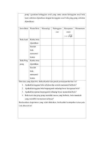 kasti sebelum dijatuhkan dengan ketinggian awal bola ping pong sebelum