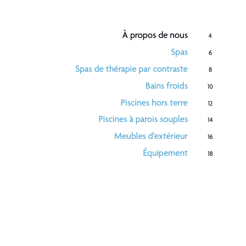 À propos de nous 4 Spas 6 Spas de thérapie par contraste 8 Bains froids 10 Piscines hors terre 12 Piscines à parois souples 14 Meubles d’extérieur 16 Équipement 18
