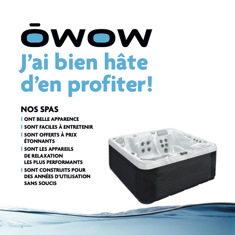 J’ai bien hâte d’en profiter! NOS SPAS ❙ ONT BELLE APPARENCE ❙ SONT FACILES À ENTRETENIR ❙ SONT OFFERTS À PRIX ÉTONNANTS ❙ SONT LES APPAREILS DE RELAXATION LES PLUS PERFORMANTS ❙ SONT CONSTRUITS POUR DES ANNÉES D’UTILISATION SANS SOUCIS 6
