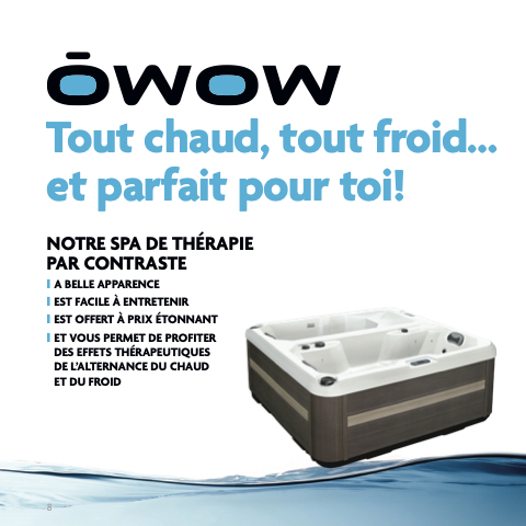 Tout chaud, tout froid… et parfait pour toi! NOTRE SPA DE THÉRAPIE PAR CONTRASTE ❙ A BELLE APPARENCE ❙ EST FACILE À ENTRETENIR ❙ EST OFFERT À PRIX ÉTONNANT ❙ ET VOUS PERMET DE PROFITER DES EFFETS THÉRAPEUTIQUES DE L’ALTERNANCE DU CHAUD ET DU FROID 8