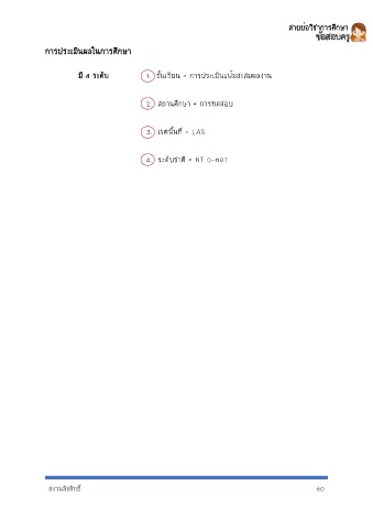ส ยย อว ช ก รศ กษ ก รประ ม นผล นก รศ กษ ม 4 ระดับ 1. ชั น ร ยน = ก รประ ม น ฟ มสะสมผลง น 2. สถ นศ กษ = ก รทดสอบ 3. ขตพ นท = LAS 4. ระดับช ต = NT o-net สงวนล ขส ทธ 60