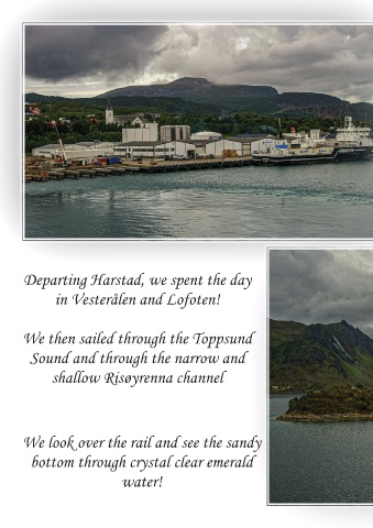 Departing Harstad, we spent the day in Vesterålen and Lofoten! We then sailed through the Toppsund Sound and through the narrow and shallow Risøyrenna channel We look over the rail and see the sandy bottom through crystal clear emerald water!