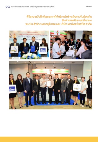รายงานประจ าปีงบประมาณ พ.ศ. 2563 ศาลยุติธรรมและส านักงานศาลยุติธรรม หน ้ า 177 พิธีลงนามบันทึกขอตกลงการใหบริการรับช าระเงินคาปรับผูประกัน ้ ้ ้ ่ เงินคาธรรมเนียม และเงินกลาง ่ ระหวาง ส านักงานศาลยุติธรรม และ บริษัท เคานเตอรเซอรวิส จ ากัด ์ ์ ์ ่