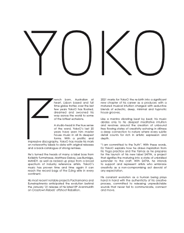 2021 marks for YokoO the re-birth into a significant new chapter of his career as a producer, with a matured musical intuition charged with seductive blends of eclectic, deep, minimal and hypnotic house grooves.