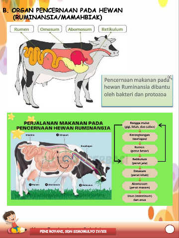 B. ORGAN PENCERNAAN PADA HEWAN (RUMINANSIA/MAMAHBIAK) Pencernaan makanan pada hewan Ruminansia dibantu oleh bakteri dan protozoa Nama Pembuat, Sekolah PENI ROYANI, SDN SIMOMULYO IV/101