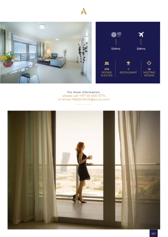 112Kms 25Kms 279 1 1 10 ROOMS ROOMS RESTAURANT MEETING & SUITES ROOMS ROOMS For more information please call +971 56 400 5774 or or email H6533-MICE@accor com 187 ... ...
