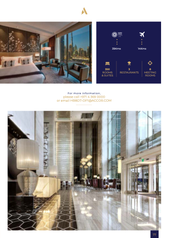 39Kms 14Kms 350 3 3 8 ROOMS ROOMS RESTAURANTS MEETING & SUITES ROOMS ROOMS For more information please call +971 4 369 0000 or email HB8D7-OP1@ACCOR COM 77 ... ...