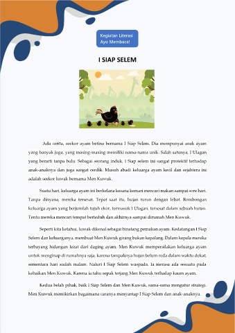 Ada cerita, seekor ayam betina bernama I Siap Selem. Dia mempunyai anak ayam