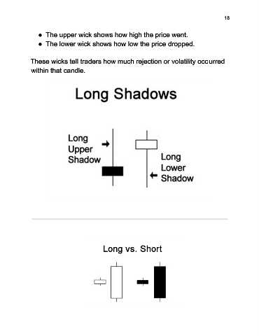 18 ● The upper wick shows how high the price went. ● The lower wick shows how low the price dropped. These wicks tell traders how much rejection or volatility occurred within that candle.