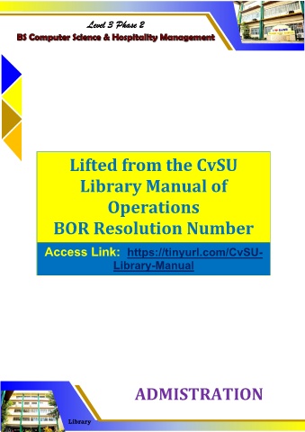 Level 3 Phase 2 BS Computer Science & Hospitality Management Lifted from the CvSU Library Manual of Operations BOR Resolution Number Access Link: https://tinyurl.com/CvSU- 44, Series 2017 Library-Manual ADMISTRATION Library