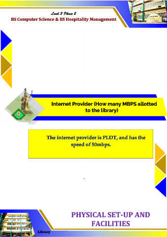 Level 3 Phase 2 BS Computer Science & BS Hospitality Management Internet Provider (How many MBPS allotted to the library) The internet provider is PLDT, and has the speed of 50mbps. . PHYSICAL SET-UP AND FACILITIES Library