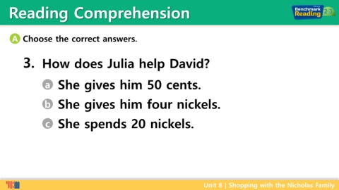 Reading Comprehension A Choose the correct answers. 3. How does Julia help David? a She gives him 50 cents. b She gives him four nickels. c She spends 20 nickels. Unit 8 | Shopping with the Nicholas Family
