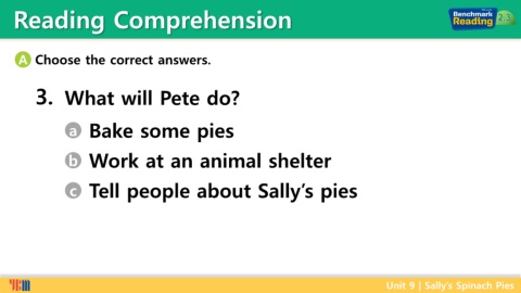 Reading Comprehension A Choose the correct answers. 3. What will Pete do? a Bake some pies b Work at an animal shelter c Tell people about Sally’s pies Unit 9 | Sally’s Spinach Pies