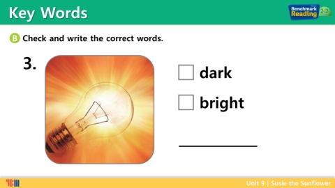 Key Words B Check and write the correct words. 3. dark bright Unit 9 | Susie the Sunflower