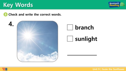 Key Words B Check and write the correct words. 4. branch sunlight Unit 9 | Susie the Sunflower