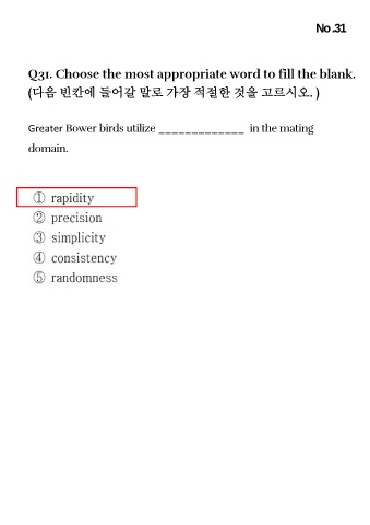No .31 Q31. Choose the most appropriate word to fill the blank. (다음 빈칸에 들어갈 말로 가장 적절한 것을 고르시오. ) Greater Bower birds utilize _____________ in the mating domain.