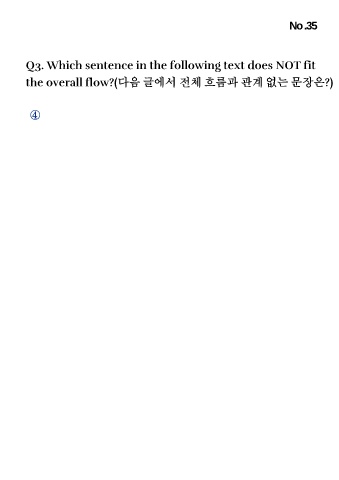 No .35 Q3. Which sentence in the following text does NOT fit the overall flow?(다음 글에서 전체 흐름과 관계 없는 문장은?) ④