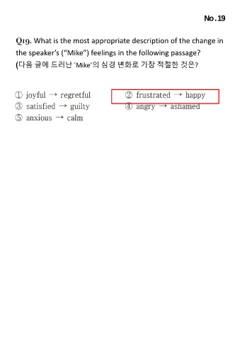 No . 19 Q19. What is the most appropriate description of the change in the speaker’s (“Mike”) feelings in the following passage? (다음 글에 드러난 ‘Mike’의 심경 변화로 가장 적절한 것은?