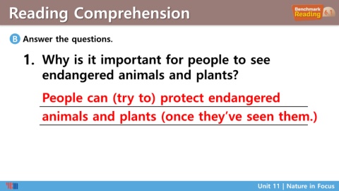 Reading Comprehension B Answer the questions. 1. Why is it important for people to see endangered animals and plants? People can (try to) protect endangered animals and plants (once they’ve seen them.) Unit 11 | Nature in Focus