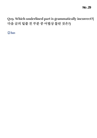 No . 29 Q29. Which underlined part is grammatically incorrect?( 다음 글의 밑줄 친 부분 중 어법상 틀린 것은?) ②has