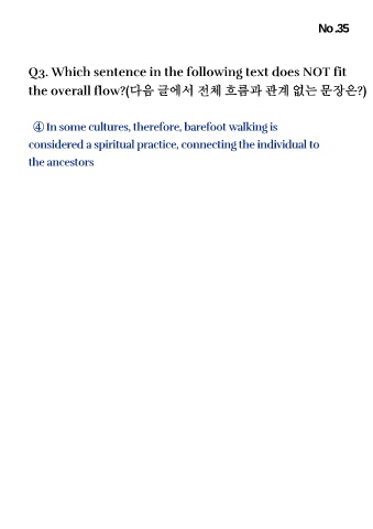 No .35 Q3. Which sentence in the following text does NOT fit the overall flow?(다음 글에서 전체 흐름과 관계 없는 문장은?) ④In some cultures, therefore, barefoot walking is considered a spiritual practice, connecting the individual to the ancestors