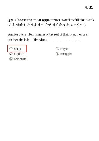 No .31 Q31. Choose the most appropriate word to fill the blank. (다음 빈칸에 들어갈 말로 가장 적절한 것을 고르시오. ) And for the first few minutes of the rest of their lives, they are. But then the kids ― like adults ― ________________.