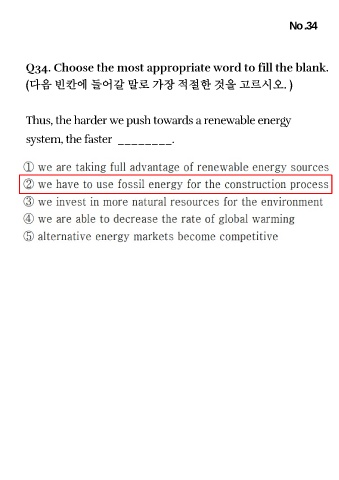 No .34 Q34. Choose the most appropriate word to fill the blank. (다음 빈칸에 들어갈 말로 가장 적절한 것을 고르시오. ) Thus, the harder we push towards a renewable energy system, the faster ________.