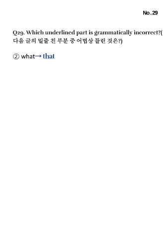 No . 29 Q29. Which underlined part is grammatically incorrect?( 다음 글의 밑줄 친 부분 중 어법상 틀린 것은?) ② what→ that