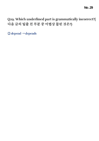 No . 29 Q29. Which underlined part is grammatically incorrect?( 다음 글의 밑줄 친 부분 중 어법상 틀린 것은?) ②depend →depends