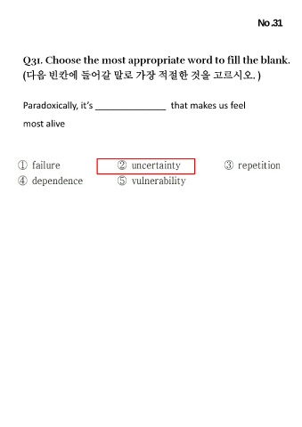 No .31 Q31. Choose the most appropriate word to fill the blank. (다음 빈칸에 들어갈 말로 가장 적절한 것을 고르시오. ) Paradoxically, it’s ______________ that makes us feel most alive