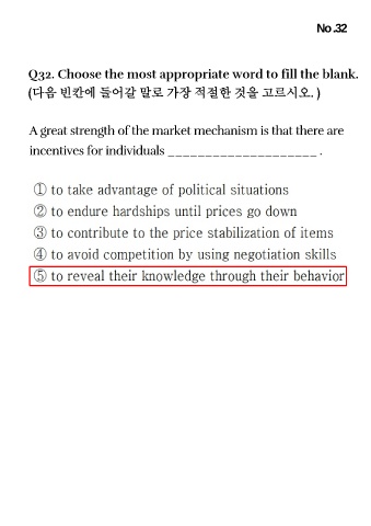 No .32 Q32. Choose the most appropriate word to fill the blank. (다음 빈칸에 들어갈 말로 가장 적절한 것을 고르시오. ) A great strength of the market mechanism is that there are incentives for individuals ____________________ .