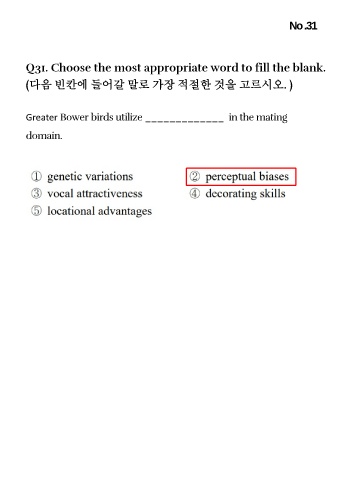 No .31 Q31. Choose the most appropriate word to fill the blank. (다음 빈칸에 들어갈 말로 가장 적절한 것을 고르시오. ) Greater Bower birds utilize _____________ in the mating domain.