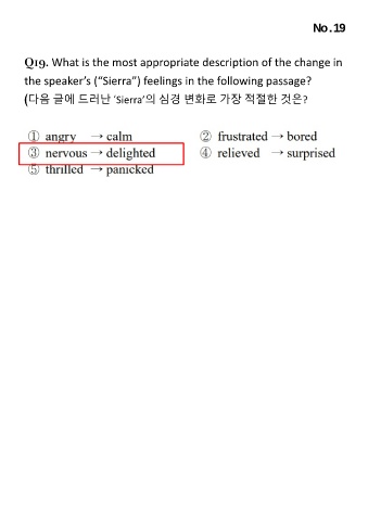 No . 19 Q19. What is the most appropriate description of the change in the speaker’s (“Sierra”) feelings in the following passage? (다음 글에 드러난 ‘Sierra’의 심경 변화로 가장 적절한 것은?