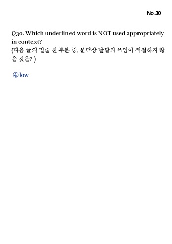 No .30 Q30. Which underlined word is NOT used appropriately in context? (다음 글의 밑줄 친 부분 중, 문맥상 낱말의 쓰임이 적절하지 않 은 것은? ) ④ low