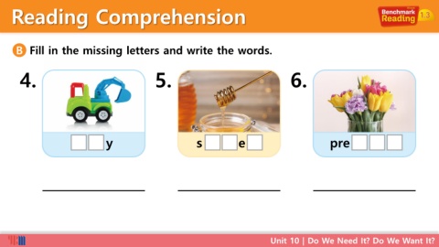 Reading Comprehension B Fill in the missing letters and write the words. 4. 5. 6. y s e pre Unit 10 | Do We Need It? Do We Want It?