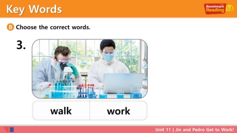 Key Words B Choose the correct words. 3. walk work Unit 11 | Jin and Pedro Get to Work!