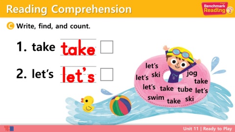 Reading Comprehension C Write, find, and count. 1. take take let’s 2. let’s let’s let’s ski jog let’s take tube take let’s swim take ski Unit 11 | Ready to Play