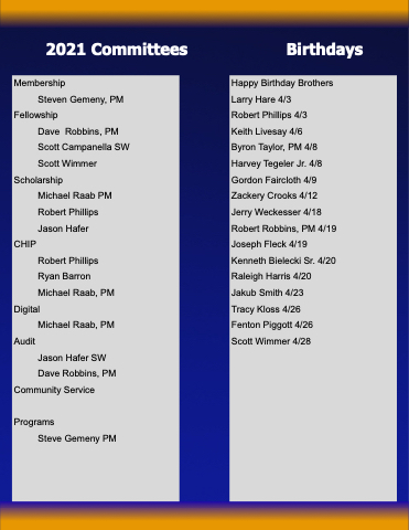 Byron Taylor, PM 4/8 Harvey Tegeler Jr. 4/8 Gordon Faircloth 4/9 Zackery Crooks 4/12 Jerry Weckesser 4/18 Robert Robbins, PM 4/19 Joseph Fleck 4/19 Kenneth Bielecki Sr. 4/20 Raleigh Harris 4/20 Jakub Smith 4/23