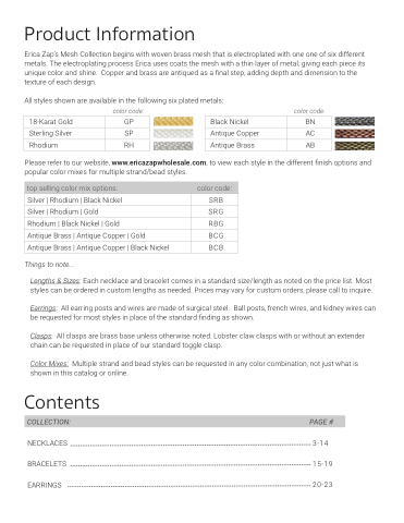 Please refer to our website, www.ericazapwholesale.com, to view each style in the different finish options and popular color mixes for multiple strand/bead styles.