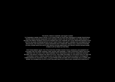 La Caminera is more than a hotel—it is a sanctuary of taste and tranquility, where traditional Spanish design blends seamlessly with modern luxury. For the Tinworths and their friends, it became the perfect retreat. Each suite offered not just comfort, but calm: windows framing olive- dotted hillsides, interiors bathed in soft earth tones, and quiet corners for conversation or reflection. The thoughtful design extended into communal spaces too: a gracious Hunters’ Lounge, where shooting boots rest beside leather armchairs, and private dining rooms where stories flow as freely as the wine.