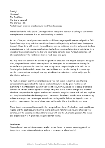 These shoots alone would look great in the run up to Royal Ascot, Cheltenham (next year) Henley regatta and the boat race, and the Polo events at Guards Polo Ground etc. and of course your core focus in the shooting world and the Glorious 12th and the UK shooting season. We should also expand this in to highland stalking and salmon fishing.