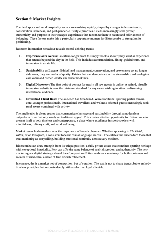 Bittescombe can draw strength from its unique position: a fully private estate that combines sporting heritage with exceptional hospitality. Few can offer the same balance of scale, discretion, and authenticity. The new marketing and digital strategy should therefore position Bittescombe as a sanctuary for both sportsmen and seekers of rural calm, a place of true English refinement.