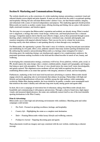 The website should serve as the cornerstone of a wider marketing strategy, presenting a consistent visual and editorial identity across digital and print channels. It must not only showcase the estate’s exceptional sporting and hospitality offering but also articulate Bittescombe’s distinct voice, one that blends tradition, integrity, and refinement with a sense of renewed independence and purpose. This marketing approach should position Bittescombe not merely as another country house offering shooting and fishing, but as a place with narrative depth, emotional resonance, and timeless appeal.