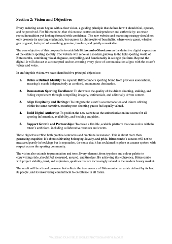 The core objective of this proposal is to establish Bittescombe-Shoot.com as the definitive digital expression of the estate’s sporting identity. The website will serve as a modern gateway to the field-sporting world of Bittescombe, combining visual elegance, storytelling, and functionality in a single platform. Beyond the digital, it will also act as a conceptual anchor, ensuring every piece of communication aligns with the estate’s values and voice.