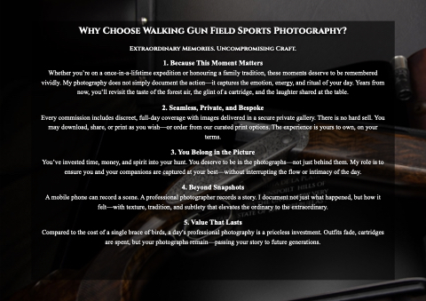Compared to the cost of a single brace of birds, a day's professional photography is a priceless investment. Outfits fade, cartridges are spent, but your photographs remain—passing your story to future generations.