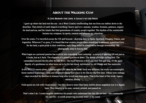 What began as a personal passion has evolved into something more enduring—a record of sporting life not just as it looks, but as it feels. The elegance of a poised gunline at dawn. The drama of a high curling bird. The camaraderie around the fire after the last drive. The bond between a child and their first gun dog. Or the quiet dignity of a gentleman on what turns out to be his last shoot, surrounded by old friends and fine memories.