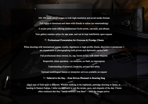 am experienced in photographing both private and diplomatic parties with: Full professional dress (tweed, tie, cap, boots) in line with estate etiquette Respectful, silent operation—no intrusion, no flash, no interruption Understanding of protocol, hierarchy, privacy and safety Optional multilingual liaison or interpreter services available on request
