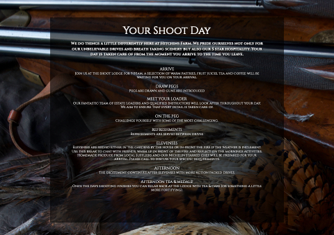 Join us at the shoot lodge for 9:00am, a selection of warm pastries, fruit juices, tea and coffee will be waiting for you on your arrival.